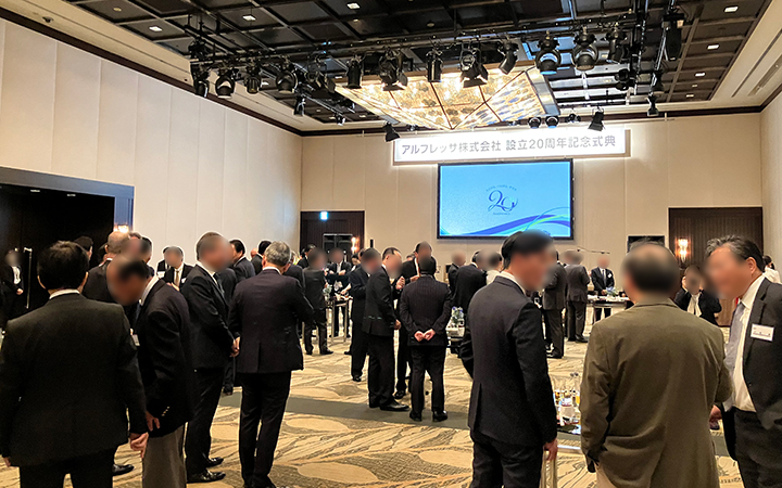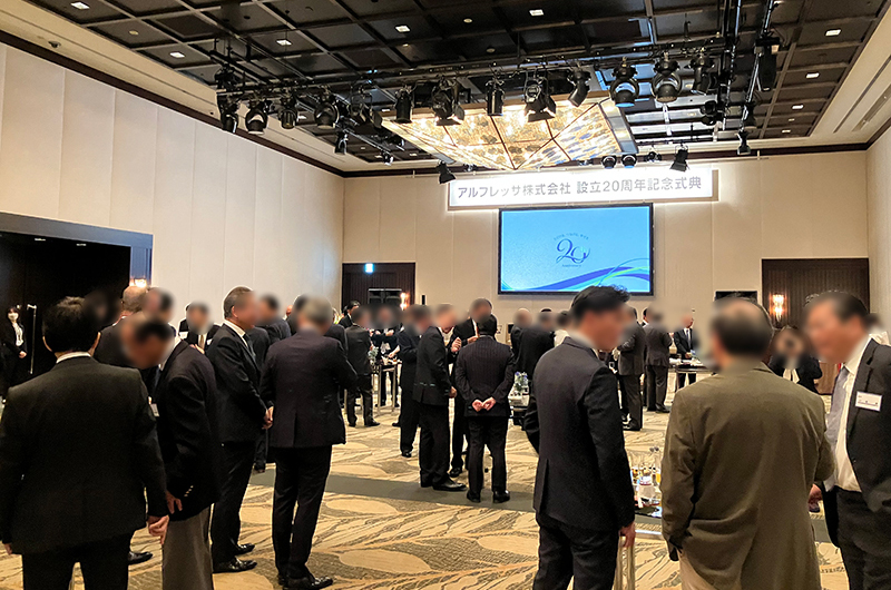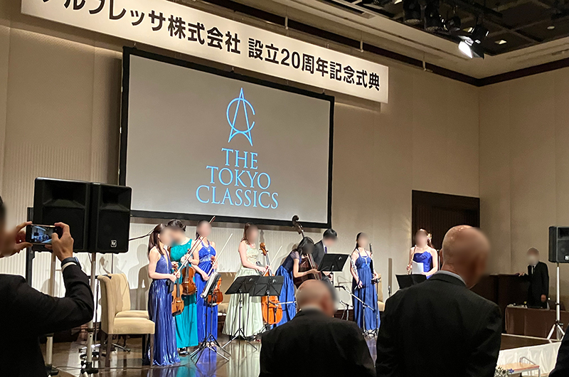 設立20周年の記念に、都内のホテルで周年記念式典を開催しました。歴代の先輩方が一堂に会し、節目を祝いました。参加者の方々の年齢層に配慮し短時間での構成としながらも、交流の時間を大切にするため、歓談は立食形式を採用。互いに語り合いやすい雰囲気を演出しました。歓談中には音楽パフォーマーによるクラシック演奏を取り入れ、会場の雰囲気をより格調高く華やかに彩りました。