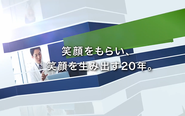 周年記念式典の開催に合わせ、周年記念映像(2分11秒)を制作。制作した記念映像は式典のオープニングで上映しました。これから始まる式典を盛り上げるような爽快で明るい音楽に合わせ、これまで歩んできた年月を想起させる写真とメッセージで構成しました。オープニング映像を見て参加者が楽しめるよう、歴代の先輩方の写真をバランスよく掲載するように工夫しました。また、社名ロゴマークに使われているブルーとグリーンをキーカラーに全体のトーンを統一しました。