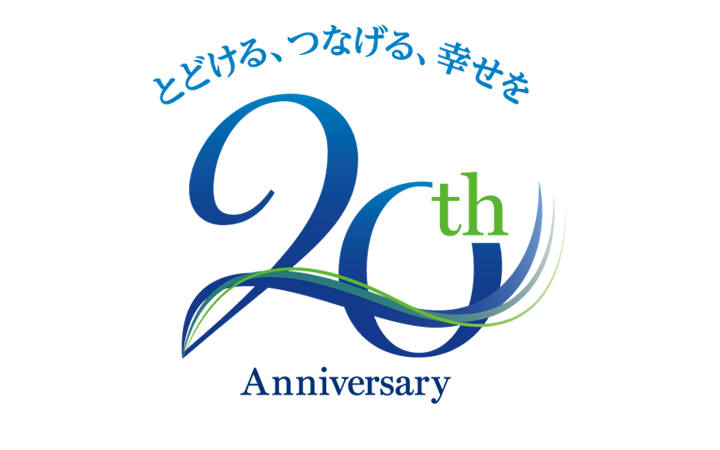 社内公募した「とどける、つなげる、幸せを」というキーメッセージをもとに、設立20周年記念ロゴマークを制作。制作したロゴマークは記念映像や名刺など、他の施策でも活用しました。