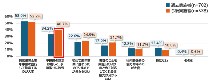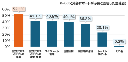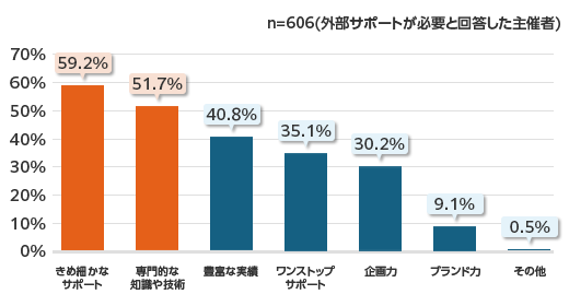また、グラフでのご紹介は割愛しますが、従業員数別にみた場合、従業員規模10,000人以上では「豊富な実績」が45.9%と全体数値よりも高い結果でした。従業員数が多い会社では、周年事業の実施規模も大きくなることが予想されますので、支援会社に実績があるのか、また必要なサポートがしっかり受けられるのか気になるのだと思います。