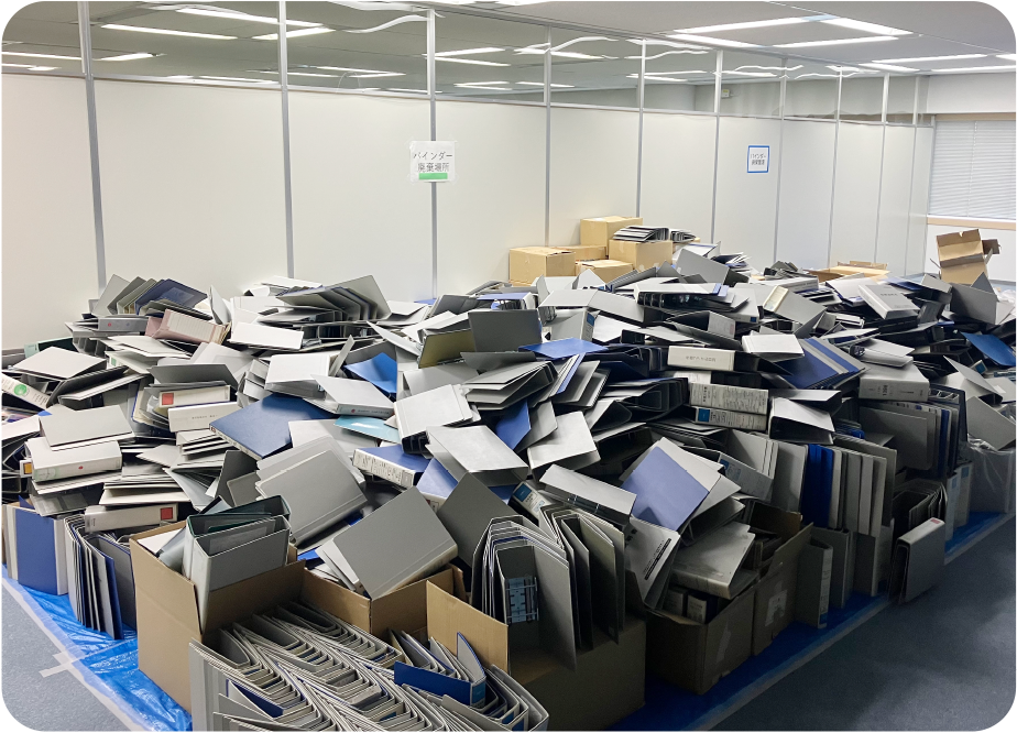 出田文書はダンボールに詰めていきましたが、空のバインダーが大量に発生しました。ブルーシートを敷いて集めたら、大きな山ができました。それだけ文書が捨てられるということで嬉しい反面、これをどうやって廃棄すれば良いのかと。リサイクル可能か調べていただきましたが難しく、産業廃棄物として処理しました。