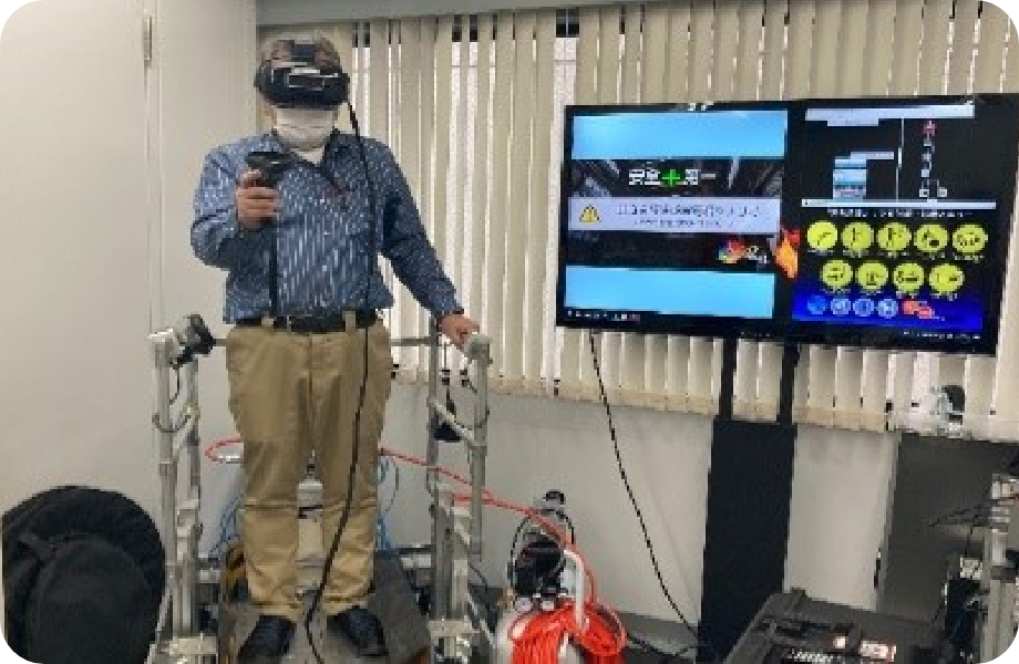 VRの仮想空間で視覚・聴覚・触覚(痛覚)に訴える災害体感を安全に再現できます。